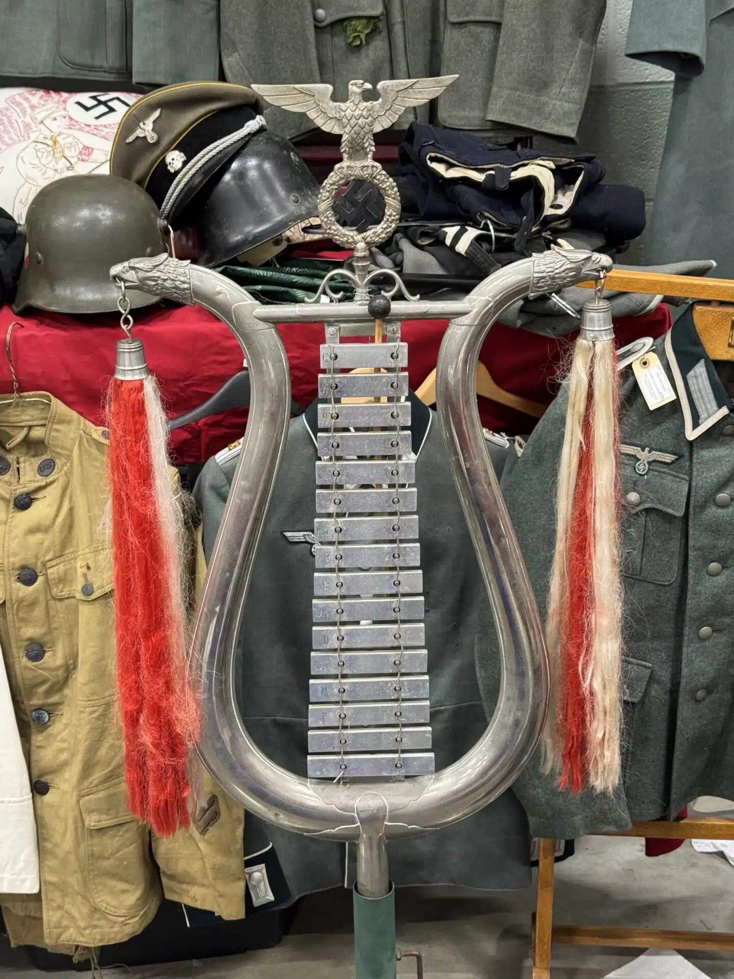 Several items surprised me. For example, the “sheet” of yellow cloth stars that Jews were required to wear in Nazi Germany—with several stars missing. And a glockenspiel bearing insignia of the Third Reich.