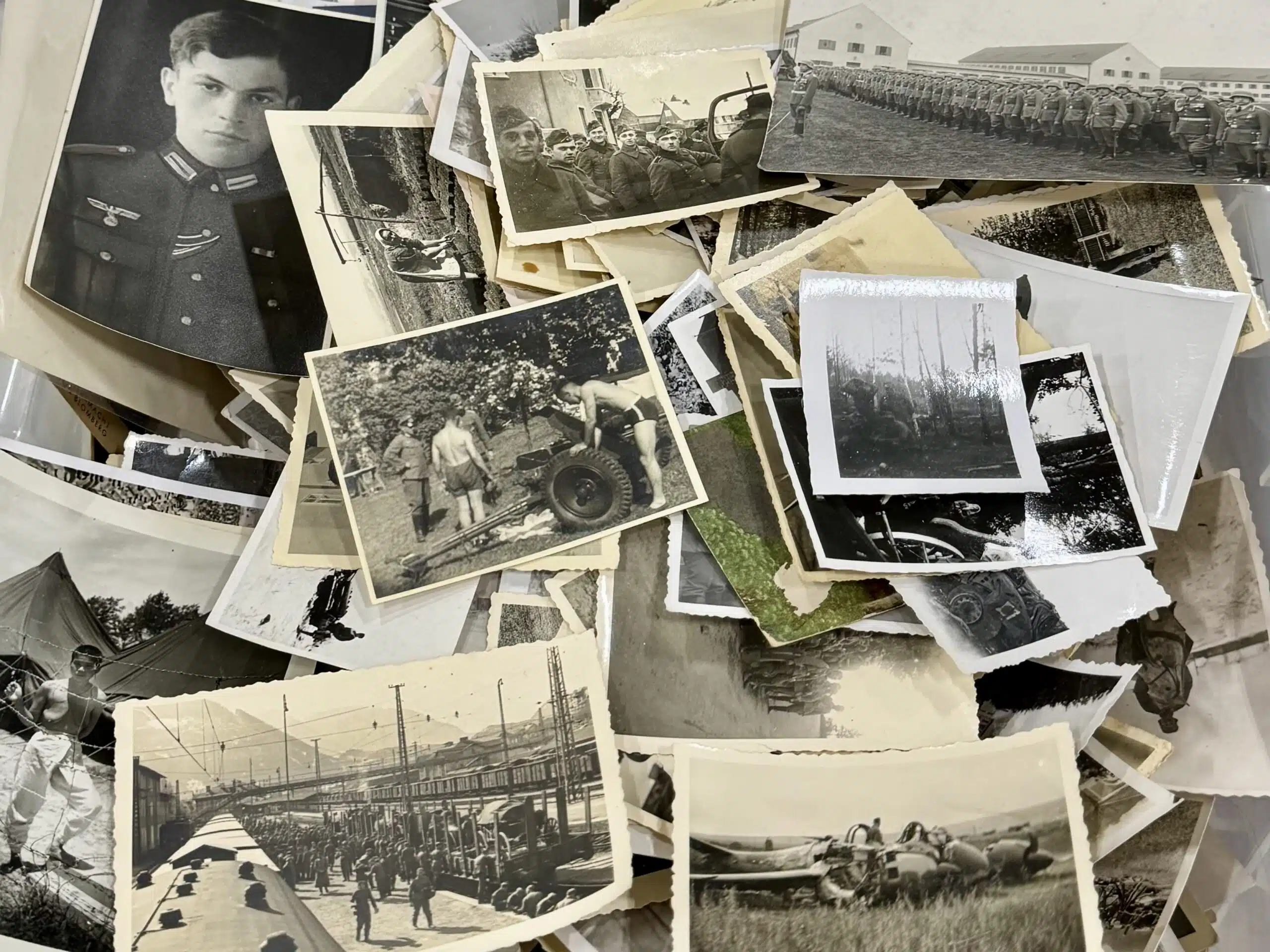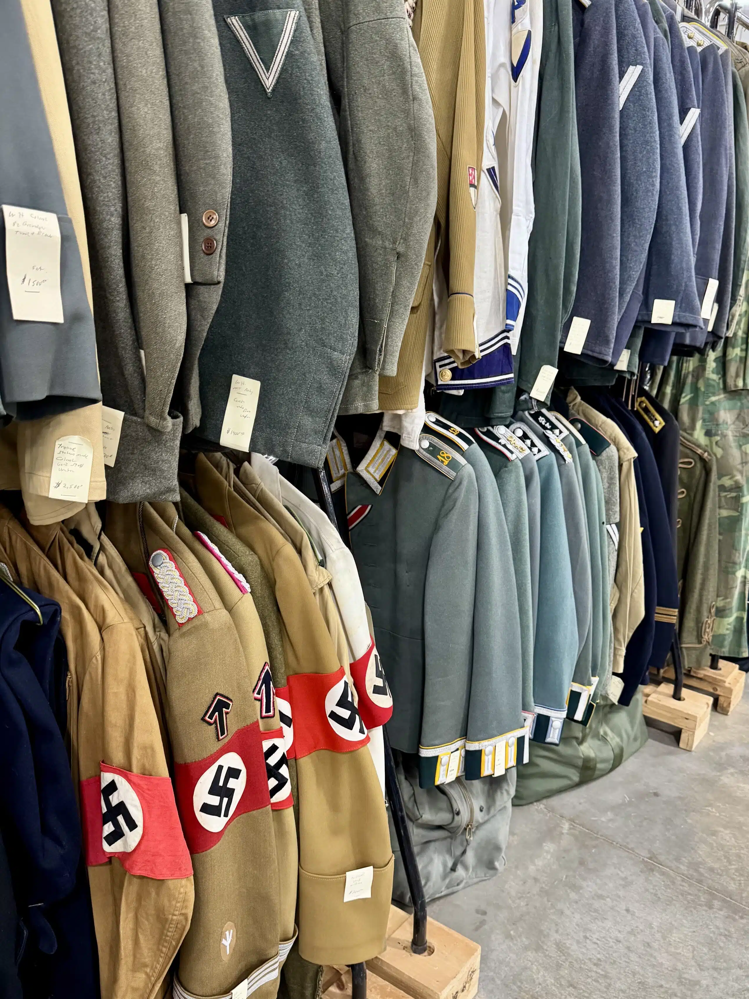Medals, patches, and helmets filled dozens of tables. Uniforms adorned mannequins and hung from racks. I even spotted toy soldiers and model vehicles, alongside propaganda posters and vintage photos. Some of the pictures were pulled from family albums—with glue and bits of the page still stuck to the back.