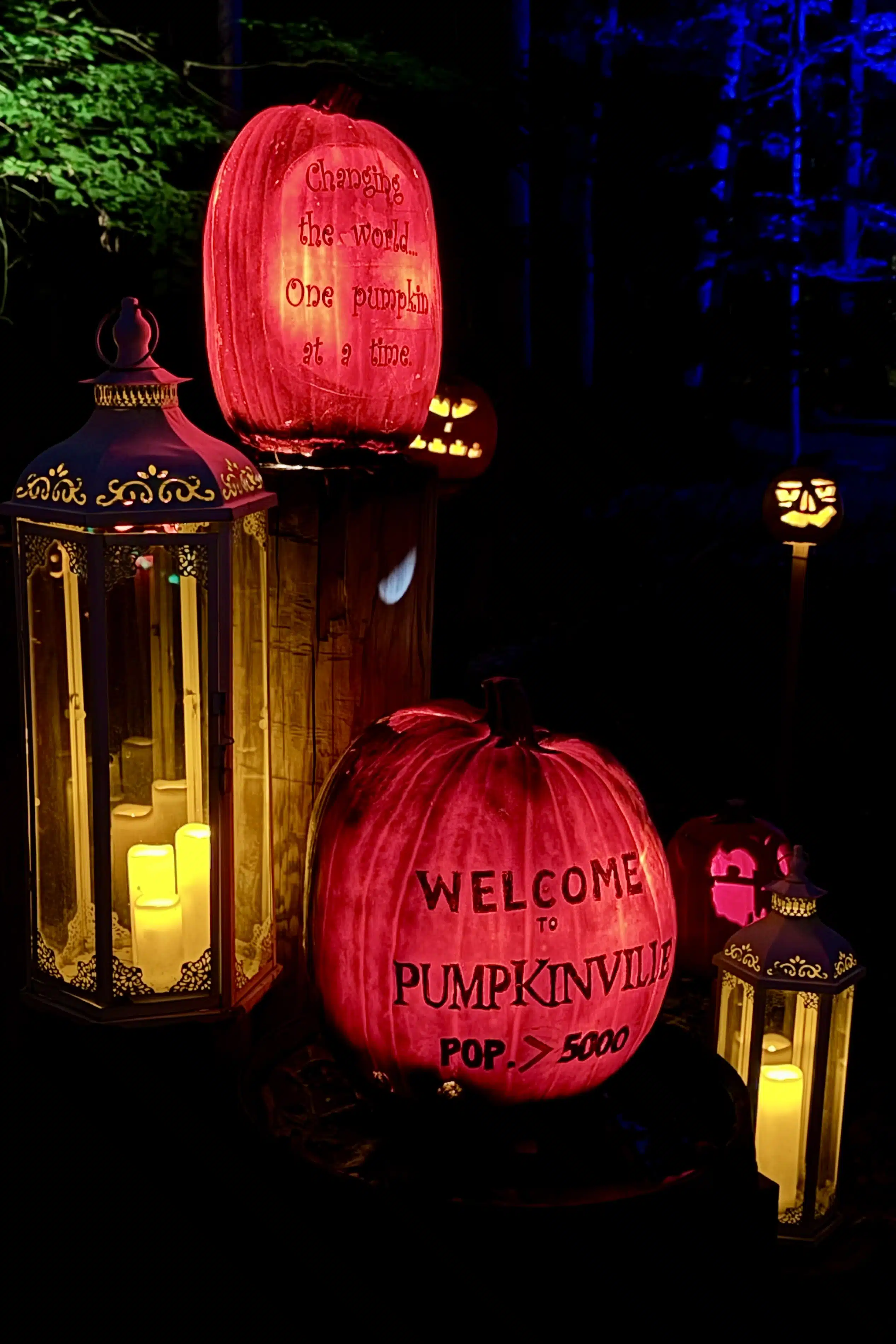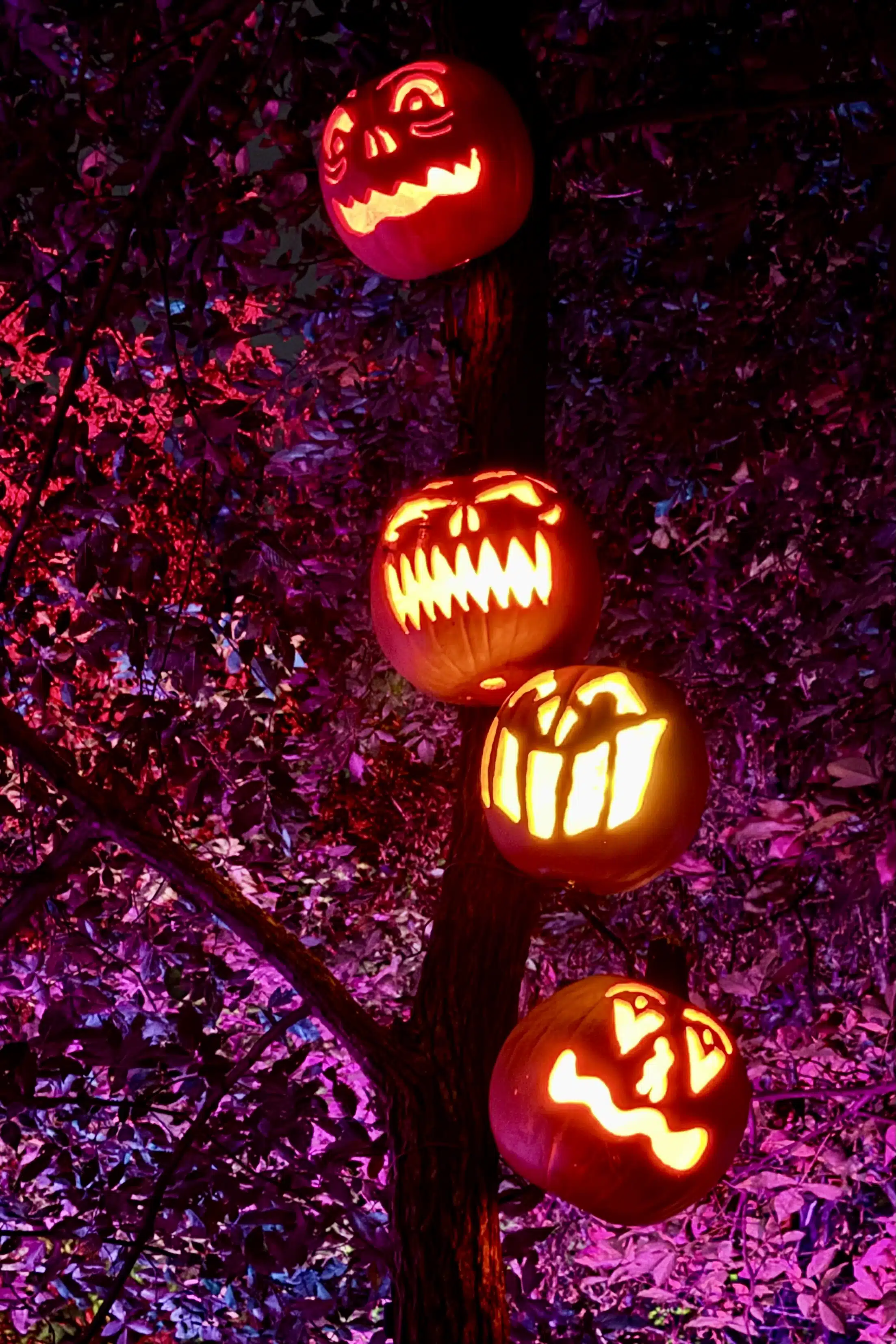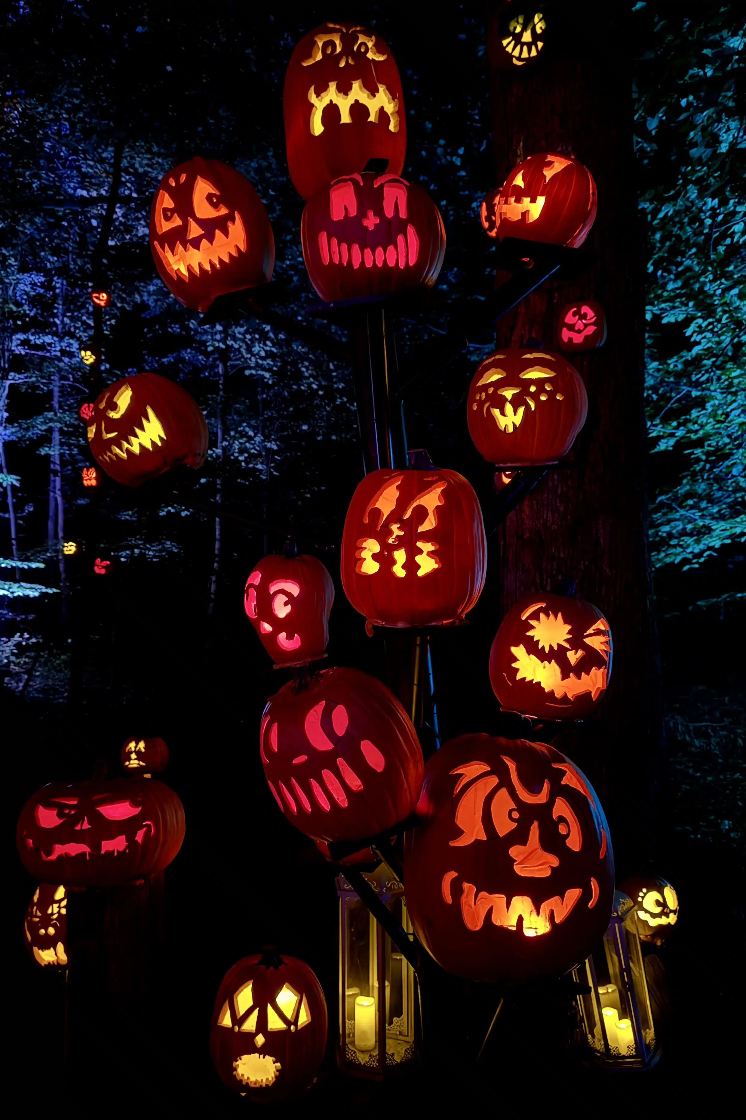 But the carving and internal illumination are only part of the equation. The finished products must then be arranged for maximum visual impact. You’ll find these organic works of art displayed individually, en masse in the hundreds, on lampposts, and in trees. Some are used as heads on scarecrows.