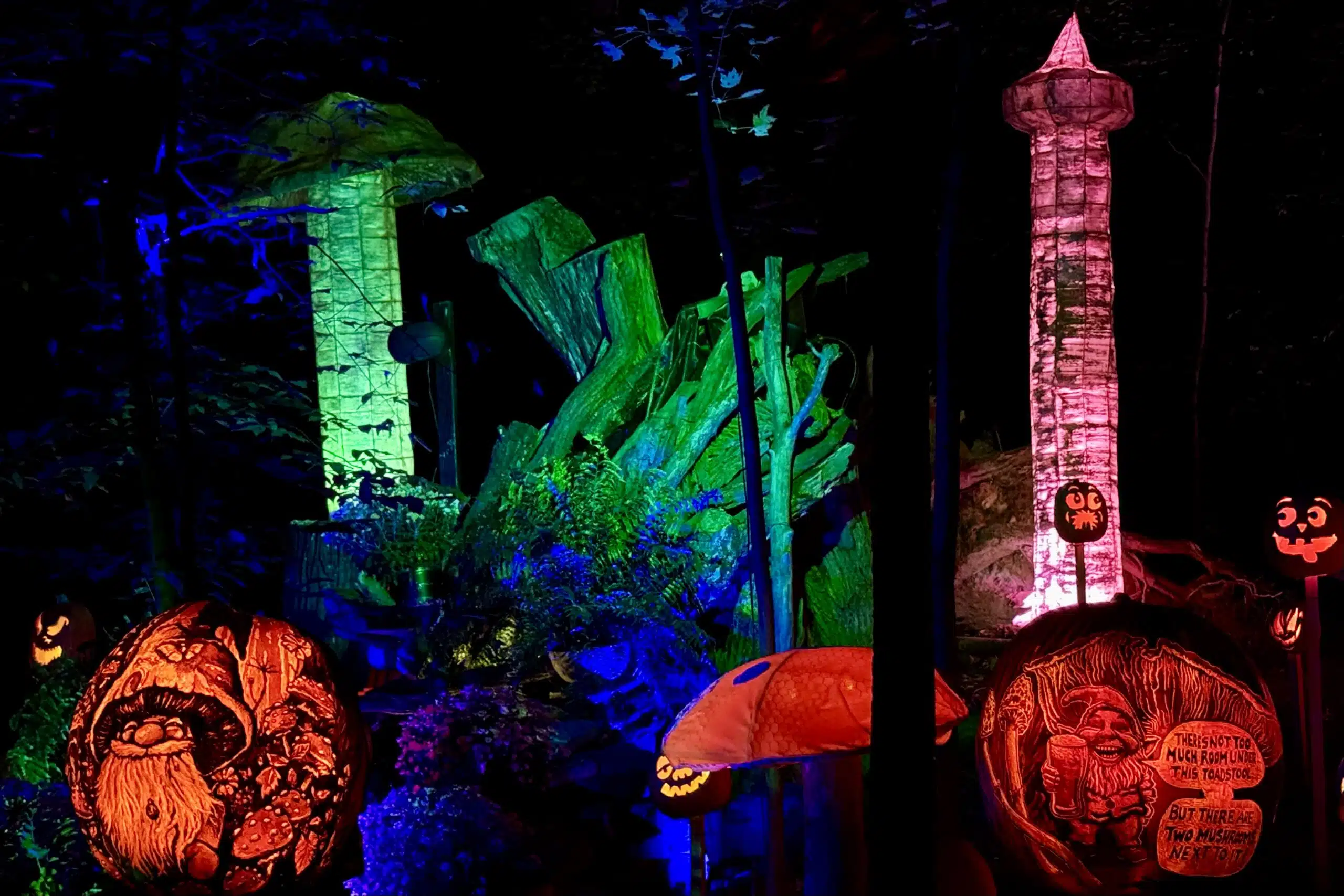 Visitors follow the “Pumpkin Trail” for one-third of a mile through the woods, where the amazingly creative pumpkin art is on display. There’s a haunted house scene. A section devoted to Disney characters. And a British-themed vignette titled, “Gourd Save the Queen.” In all, there must be nearly 30 distinct scenarios. I’ve never seen anything like it.